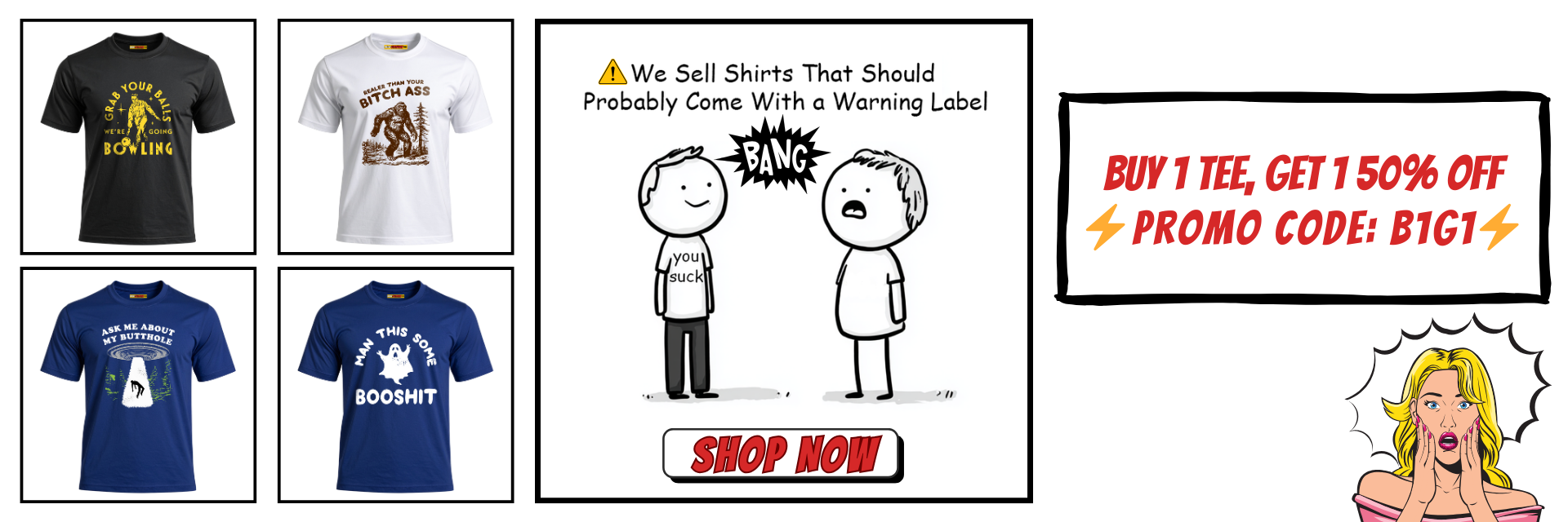 We may sell offensive tees, but our support team is offensively good. Whether you need sizing help, order updates, or emotional support after reading your shirt aloud — we’re here.