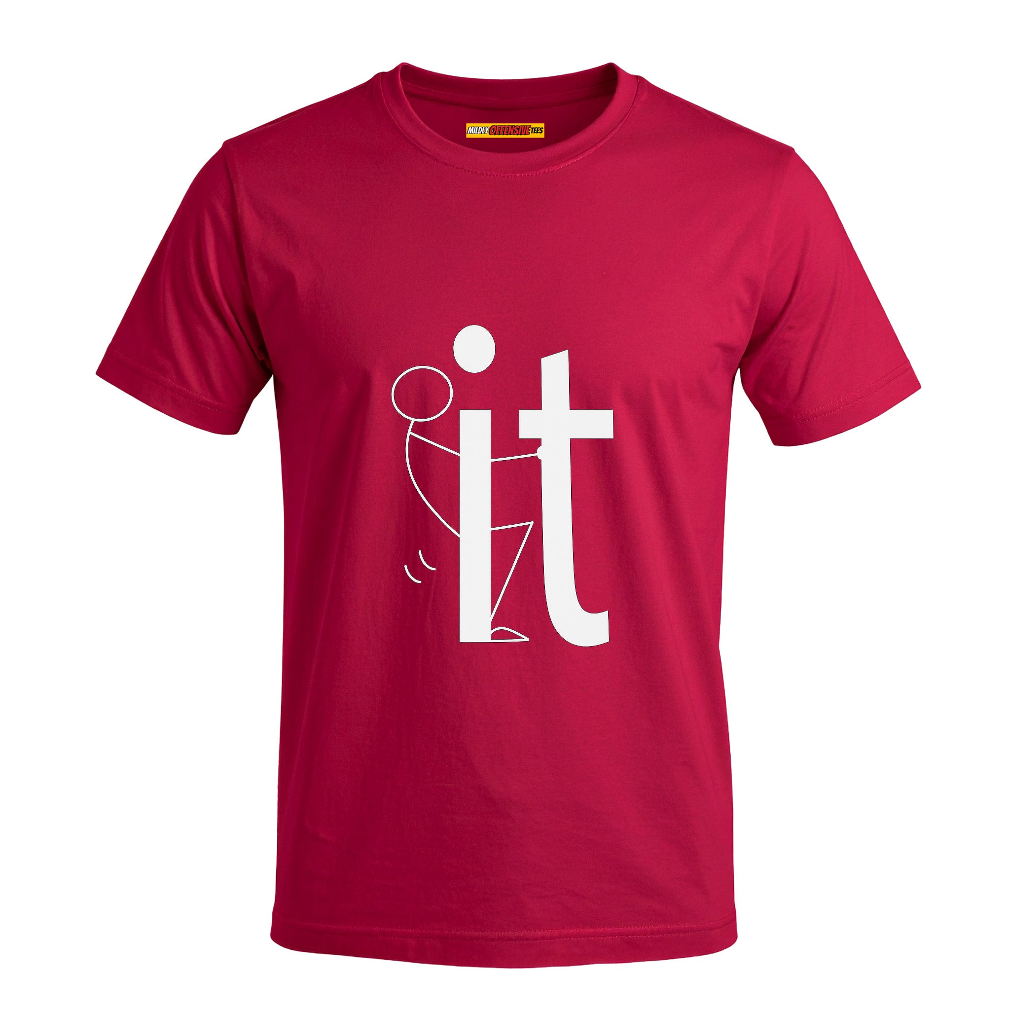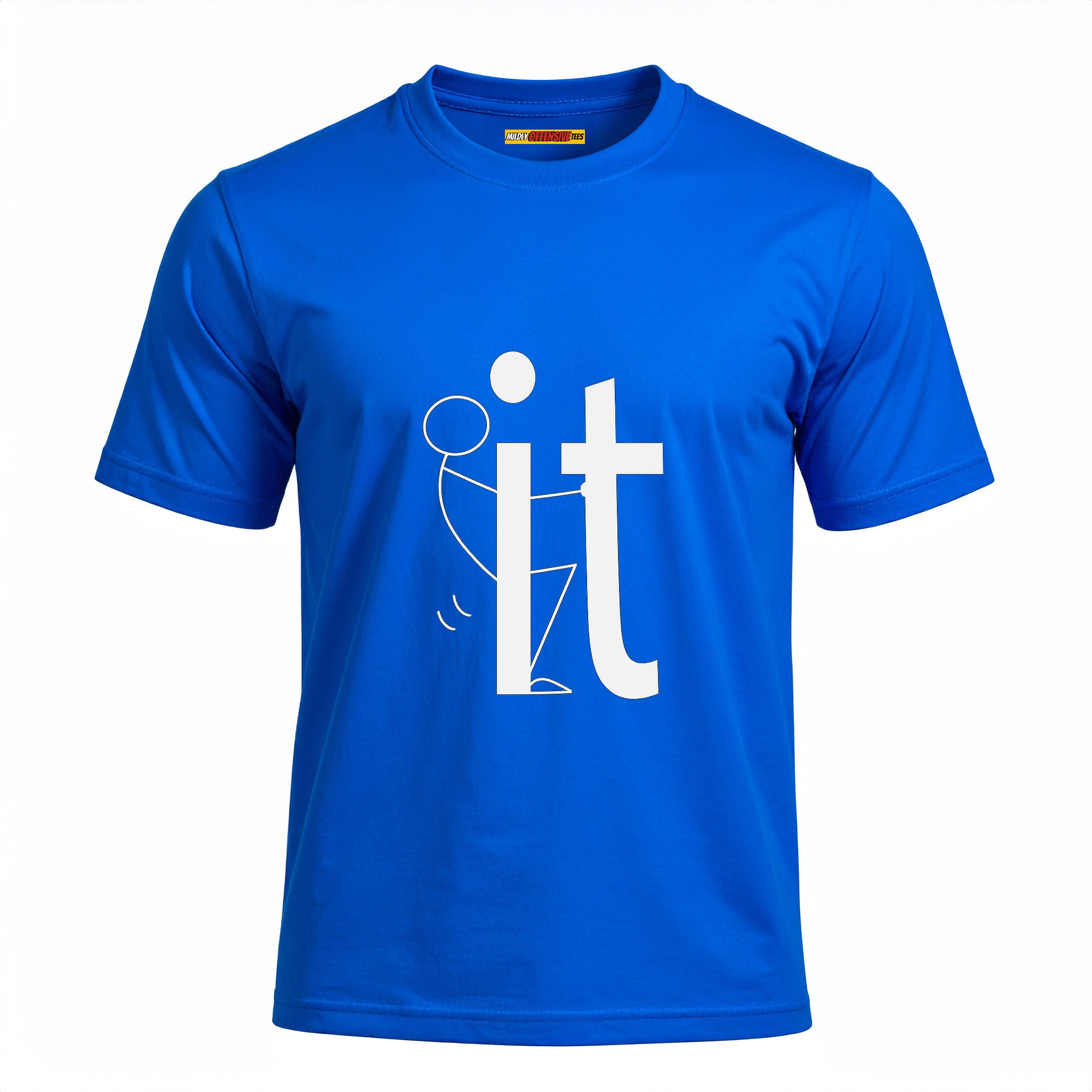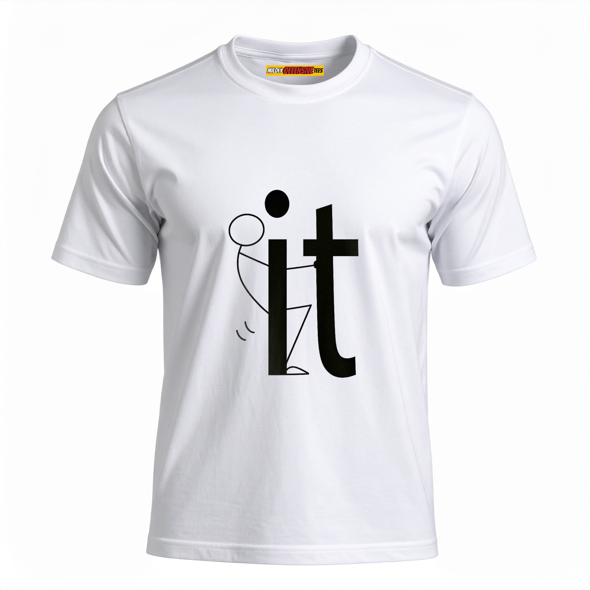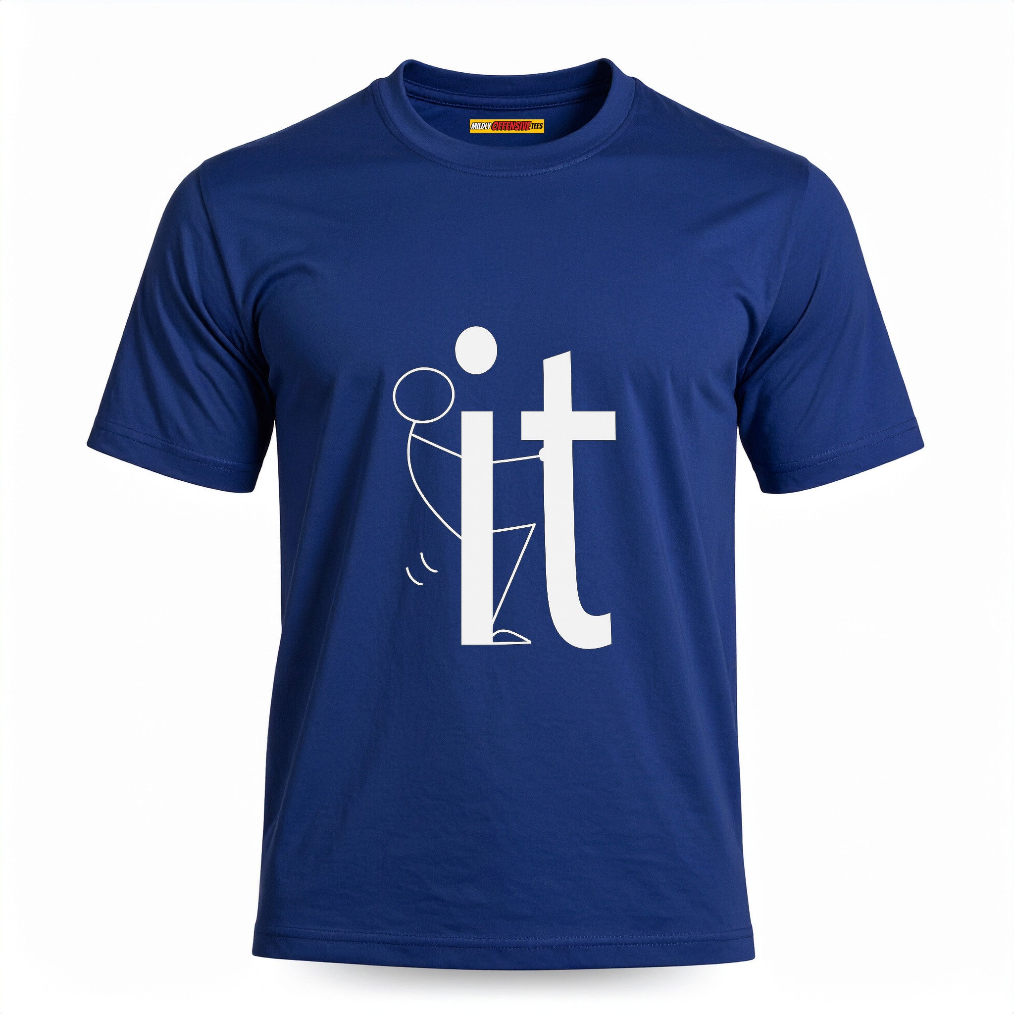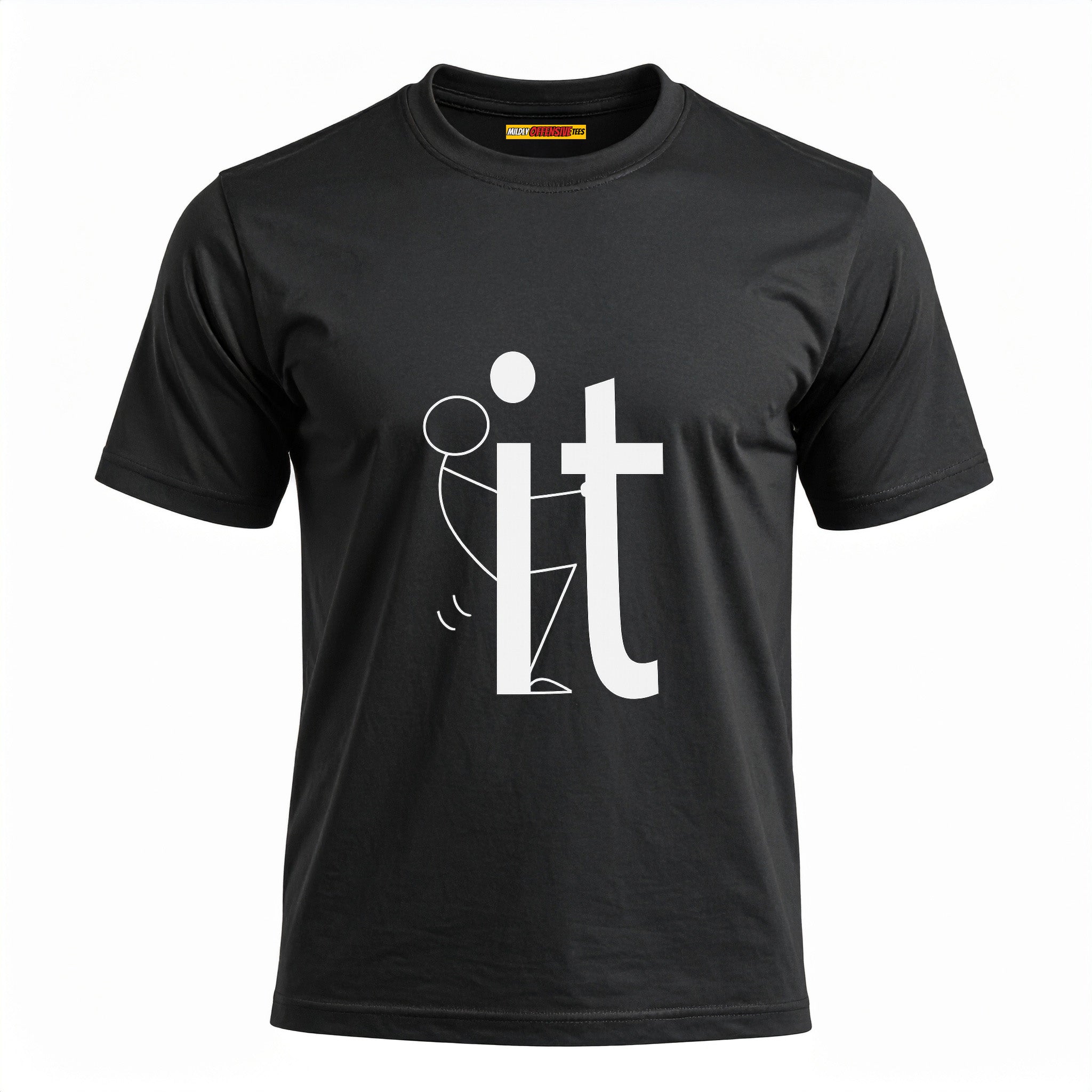 Alright, here it is. A stick figure literally screwing the word IT. You wanted subtle? Go buy a cardigan. This shirt’s about being done with pretending you’ve got your life together. It’s vulgar, it’s childish, it’s inappropriate as hell… and that’s why it’s funny.